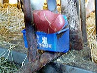 牛も人間と同様に塩が必要です。常に塩の塊(1個5キロ)を飼槽の横のトレイに置いておきます。牛は自分で好きなときに、ペロペロとなめています。この塩の塊は、牛の体に必要なミネラルも混ぜられています。牧草にはカリウムも含まれているので、ナトリウムをとることで体のバランスが保たれます。写真の赤っぽい固まりが塩です。