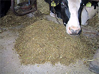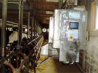 給餌機はデイリーサポート士別で混合された餌(TMRと呼ぶ)を、1日6回自動的に与えます。餌の量は一頭ごとにコンピュータ管理されています。給餌機の中の餌がなくなると、自動的に補給に行きます。補給用の餌はタイヤショベルを使って、ストッカー(餌を蓄えるところ)の上に載せておきます。