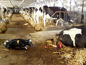 朝8時ごろ妊娠牛の出産が始まりました。中の子牛の様子を調べてみると、なんと逆子(さかごといい、正常な出産は前足次に頭の順ですが、逆子の場合後ろ足から生まれてきます)です。自然分娩では出産が難しいので人により介助します。「産科ヘルパー」という機器(お産を介助する道具)を使用し、妻と二人で後ろ足より引っ張り出しました。無事出産し、母子(メス牛でした)とも元気です。何度出産に立会っても感激ひとしおです。今後この子牛の成長を随時、日誌に記していきます。ご期待下さい。 昨日、日本で6頭目のBSE(いわゆる狂牛病)牛が和歌山県で見つかりました。原因はまだはっきりしていませんが、今までの6頭とも同じメーカーの代用乳(子牛用ミルク)を飲ませていたとのことです。同じ酪農家として他人事ではありません。しかし世間に出回っている国産牛肉は完全に検査で合格したものですのでご安心ください。 |