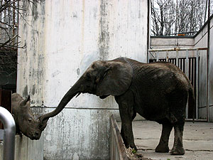 今,全国で人気の動物園というので沢山の人が来られてました。  ペンギン,北極ぐま,オラウータンやアザラシなどの人気の動物には長蛇の列で観るまでが一苦労です。  そんな中ヒッソリと象とサイが隣どうしで,仲良くランデブー。  非常にほほえましい光景でした。 |