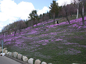 山一面に芝桜が植えられていて満開になれば非常にきれいですが,今年は寒さのせいかまだ3分咲き程度なのでもう一つでした。  去年も同じ時期に来たのですが満開できれいでした。  去年は芝桜公園上空をヘリコプターで遊覧飛行しました。乗る人が少なくヘリコプターの係りの人が暇そうにしていたので,冗談に,「妻は背が低いので,子供料金なら乗ってもイイですよ」と言うと”OK”してくれ遊覧飛行しました。  上から観る芝桜もまたきれいでしたヨ。 |