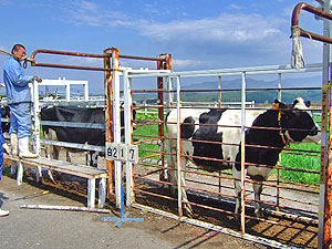 1頭ごとに予防注射、体重測定、消毒などを済ませて600ヘクタールもある広大な牧草地へと飛び出していきました。今日から10月の中ごろまで沢山草を食べ、良く運動をして、見違えるように大きくなって帰って来る事を楽しみにしています。 |