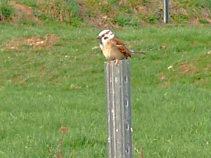 よく見ると”スズメ”です。でも普通のスズメは頭が茶色ですが、このスズメは真っ白の頭です。 可愛いのですが、何か突然変異でこうなったのか不思議です。 |