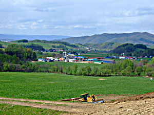 建設地が小高い丘になっている為、大型機械で起伏部分を削り平らにしています。今年の秋の稼働を目指し、6月からの建設が始ります。(写真の二番目に見えるサイロの牧場が私の牧場です) |