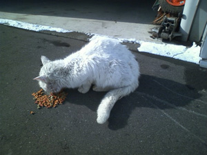 この頃、白い猫が私の牧場の周りをうろちょろしています。 今日も、車庫の前でたたずんでいたので、餌を与えましたが、おとなしくて、どこかの家で飼われていた猫だと思います。