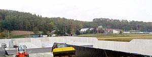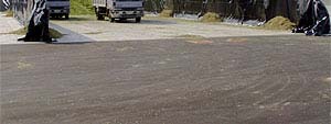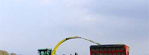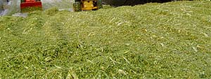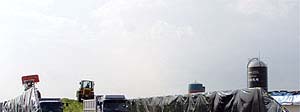バンカーサイロにトラックで運ばれたデントコーンを貯蔵します。巨大なバンカーサイロ(幅12m、奥行き50m、高さ2,7m)の中でトラック、タイヤショベルが小さく見えます。バンカーサイロというのは建設費のかかるタワー型サイロにかわって考案されたもので平地にコンクリートでコの字状の囲いを作り、刈り取って細かくした草やデントコーンを奥から順につめて行き、最後に上からビニールでふたをして空気を遮断するようになっています。草やデントコーンは別々のバンカーサイロにいれられ、およそ40日ほどかけて発酵させ、それぞれ「草サイレージ」と「デントコーンサイレージ」となります。これらのことから分かるように、サイロというのはサイレージを作って貯蔵する装置であって、干し草の貯蔵庫ではないのです。皆さんがよく目にする「干し草ロール」は雨で湿らないように倉庫に保管します。
