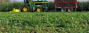 デイリーサポート士別(共同収穫/共同餌調整)に向けてデントコーン(牛に与えるとうもろこし)の収穫作業です。大型ハーベスタ(収穫機)で迅速に収穫していきます。デントコーンというのは、牛のサイレージ用に開発されたトウモロコシで、葉や茎も全部小さく切ってサイレージにしてしまいます。